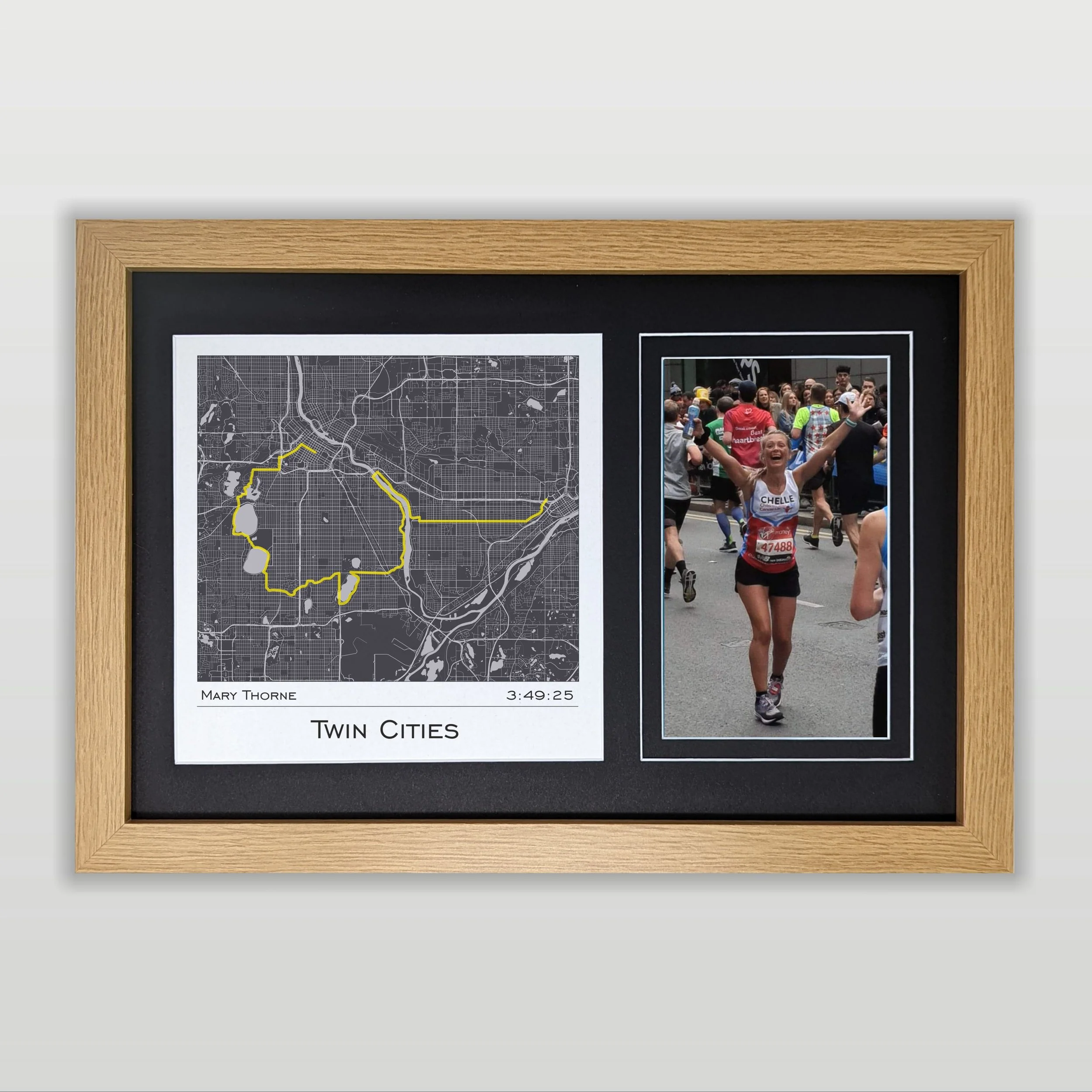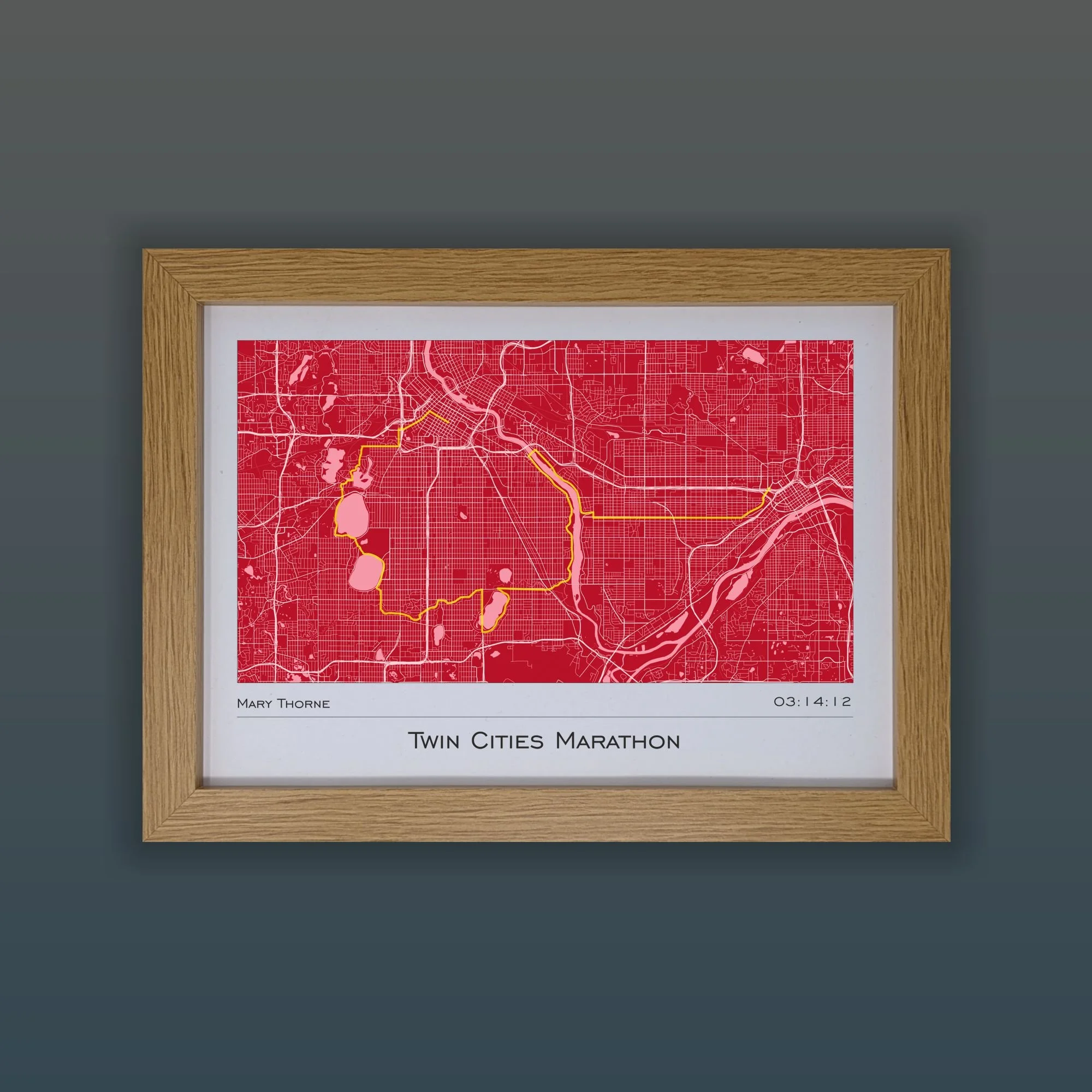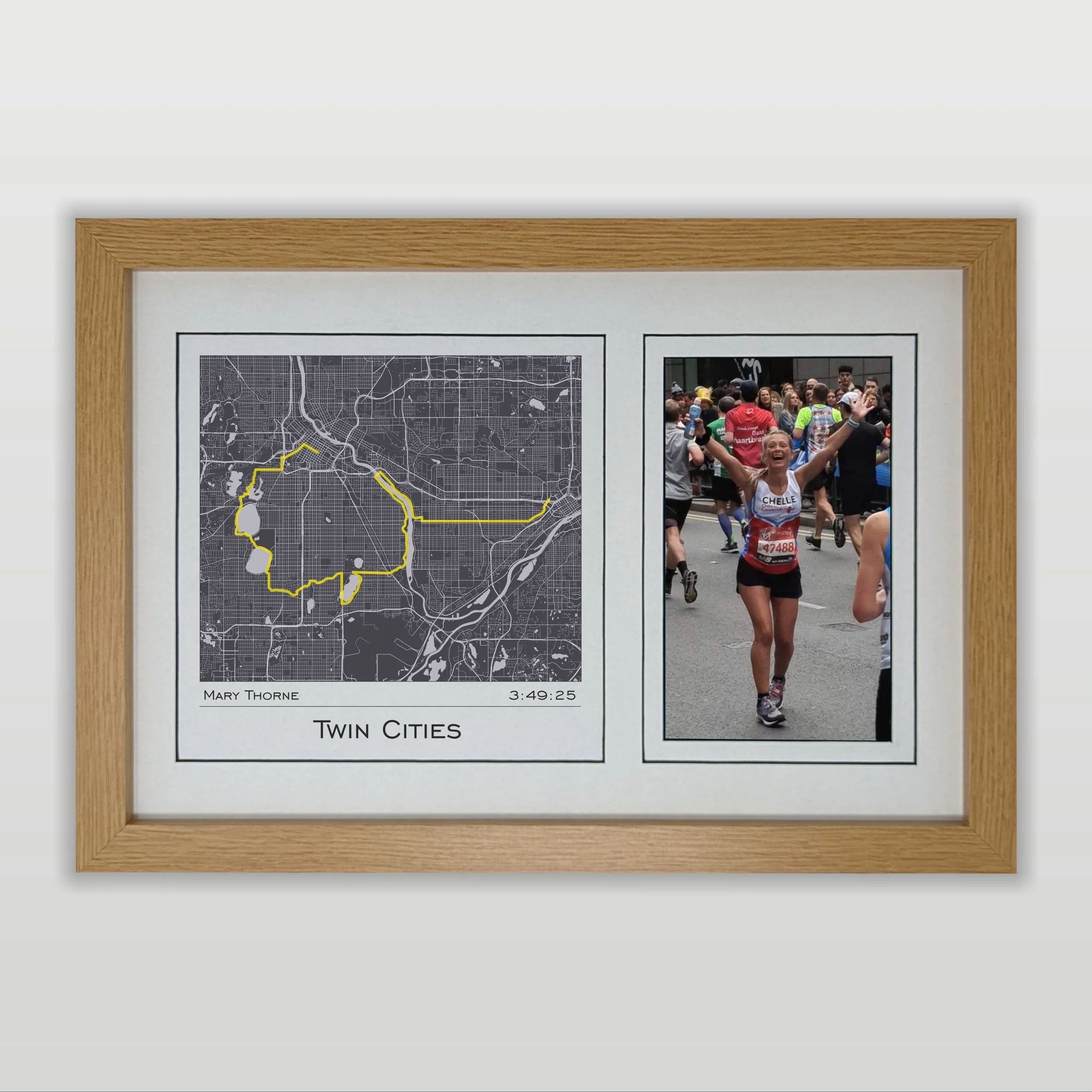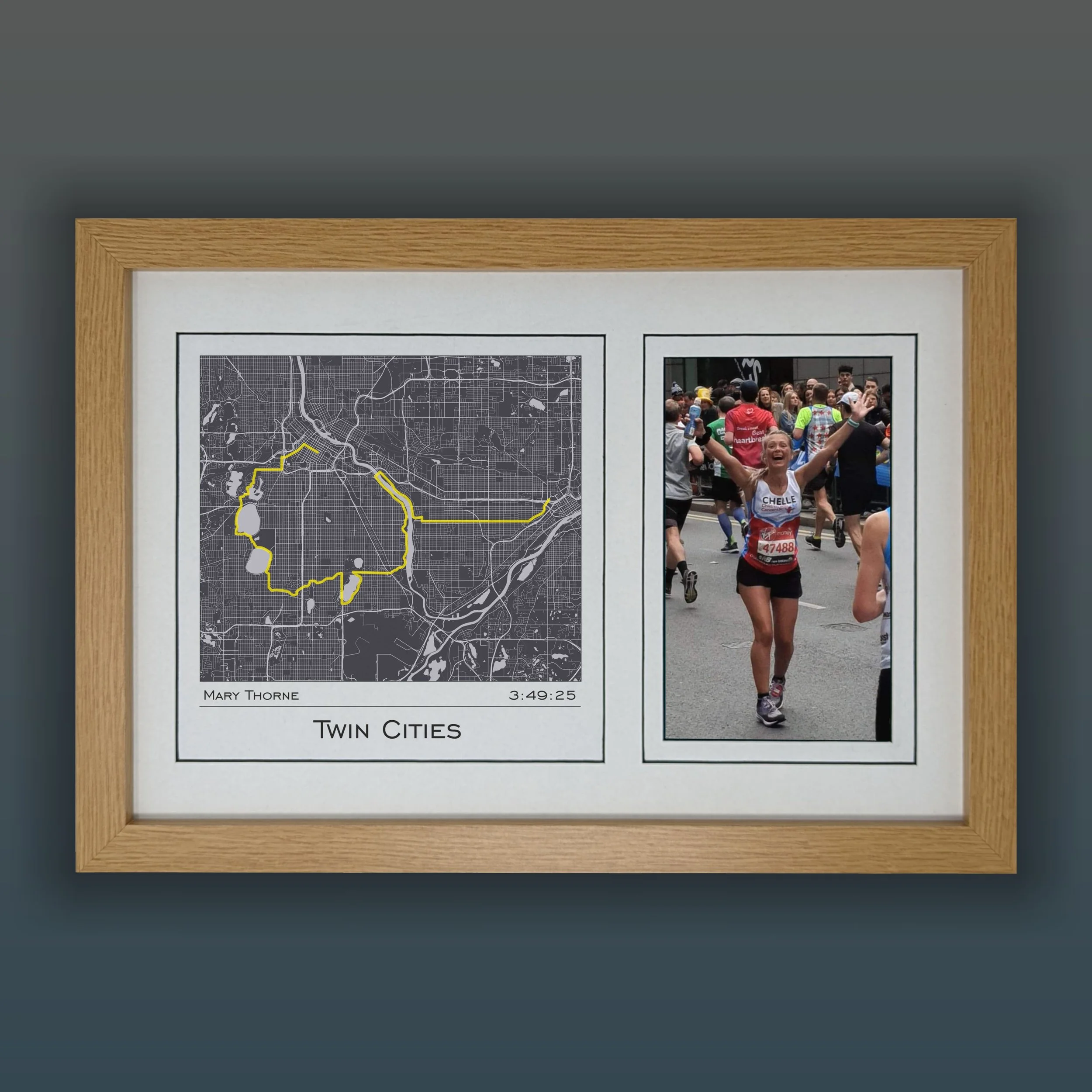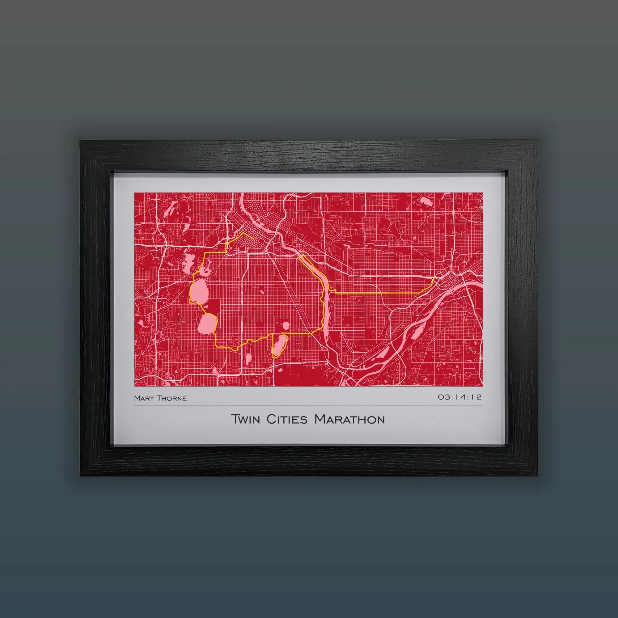 Create a beautiful Twin Cities marathon marathon route map and double medal display for your Twin Cities marathon marathon medals. All our Twin Cities marathon marathon route maps and double medal displays come framed as standard. Professionally printed on photographic grade paper and framed for a stunning finish. These can be made for “Any” run. (how?)