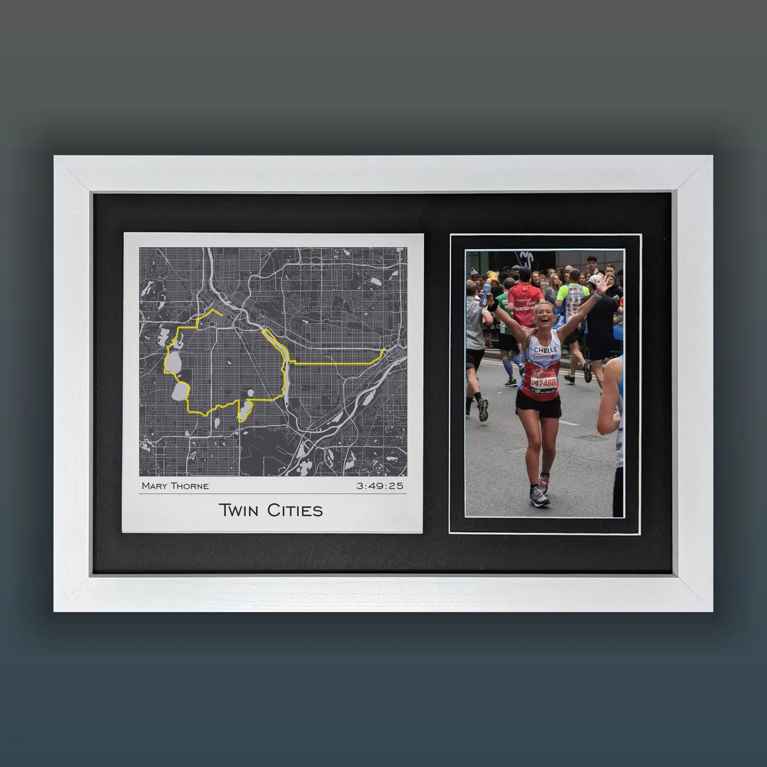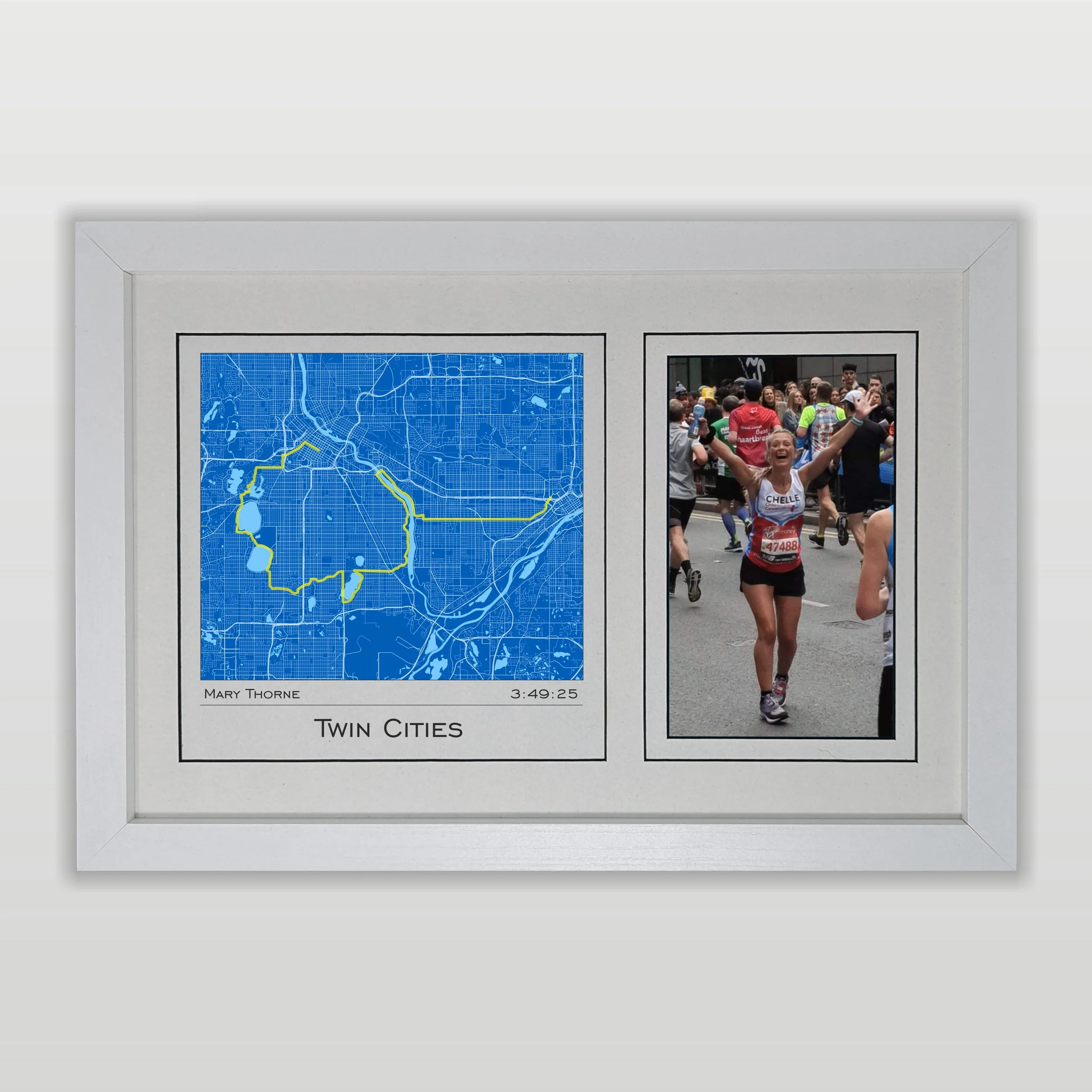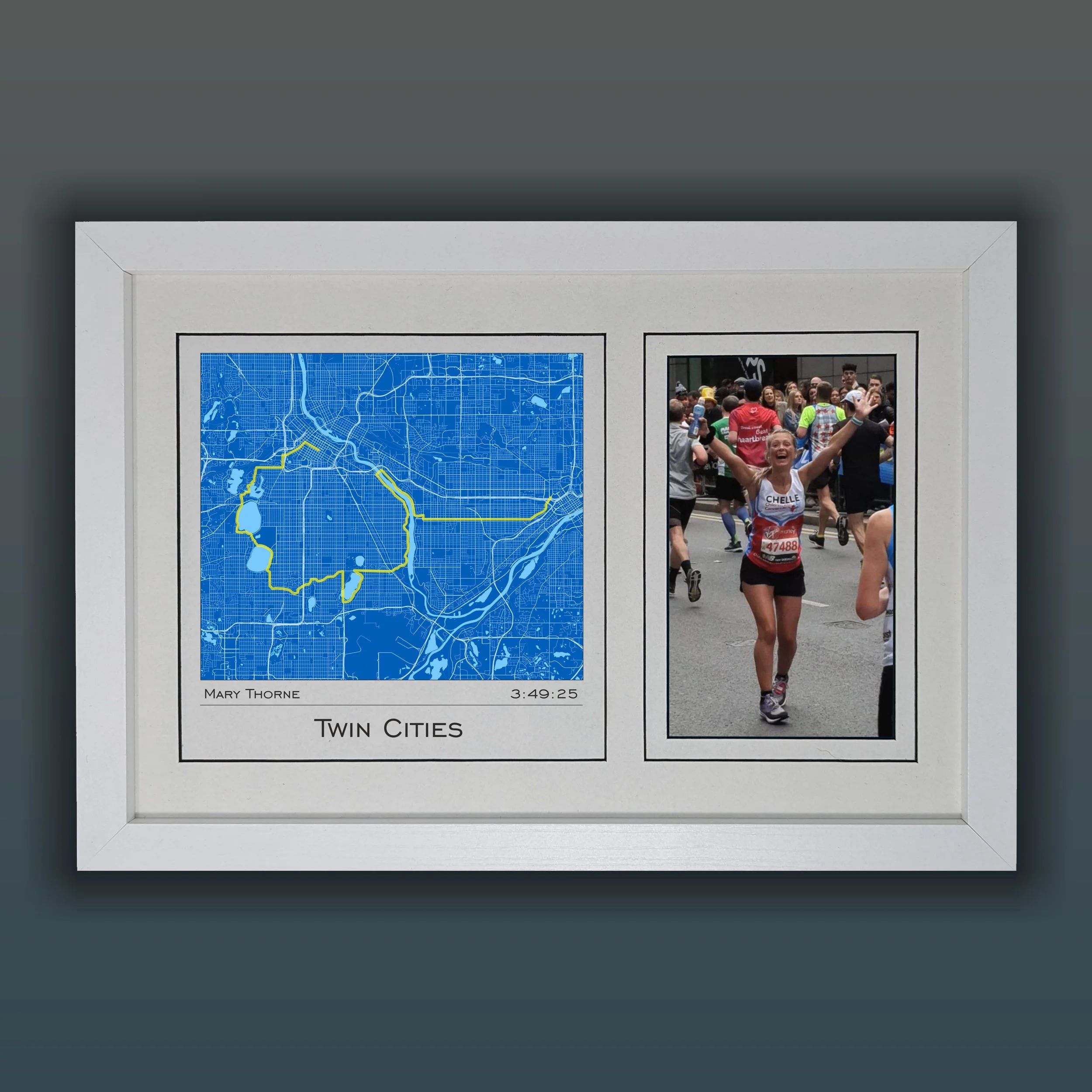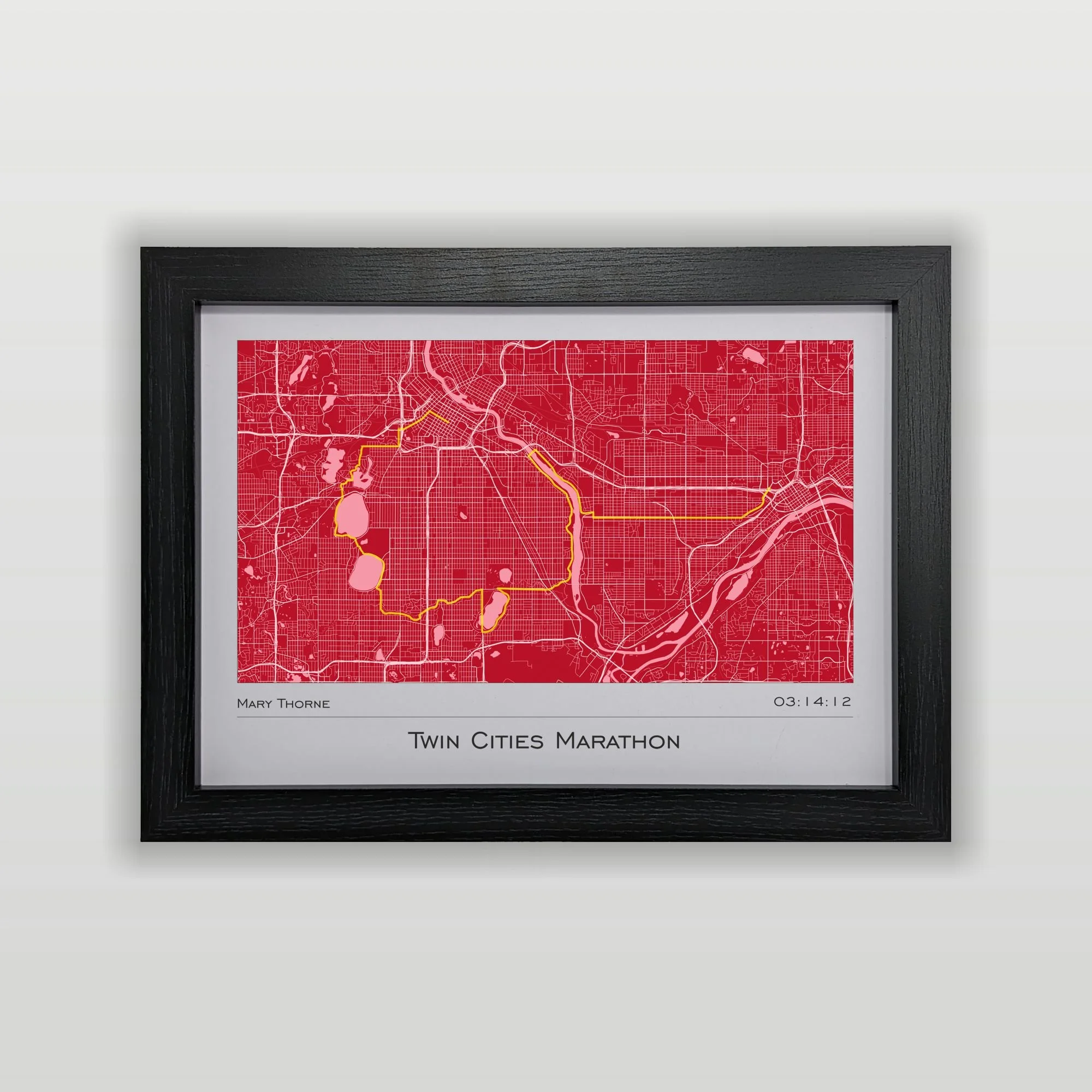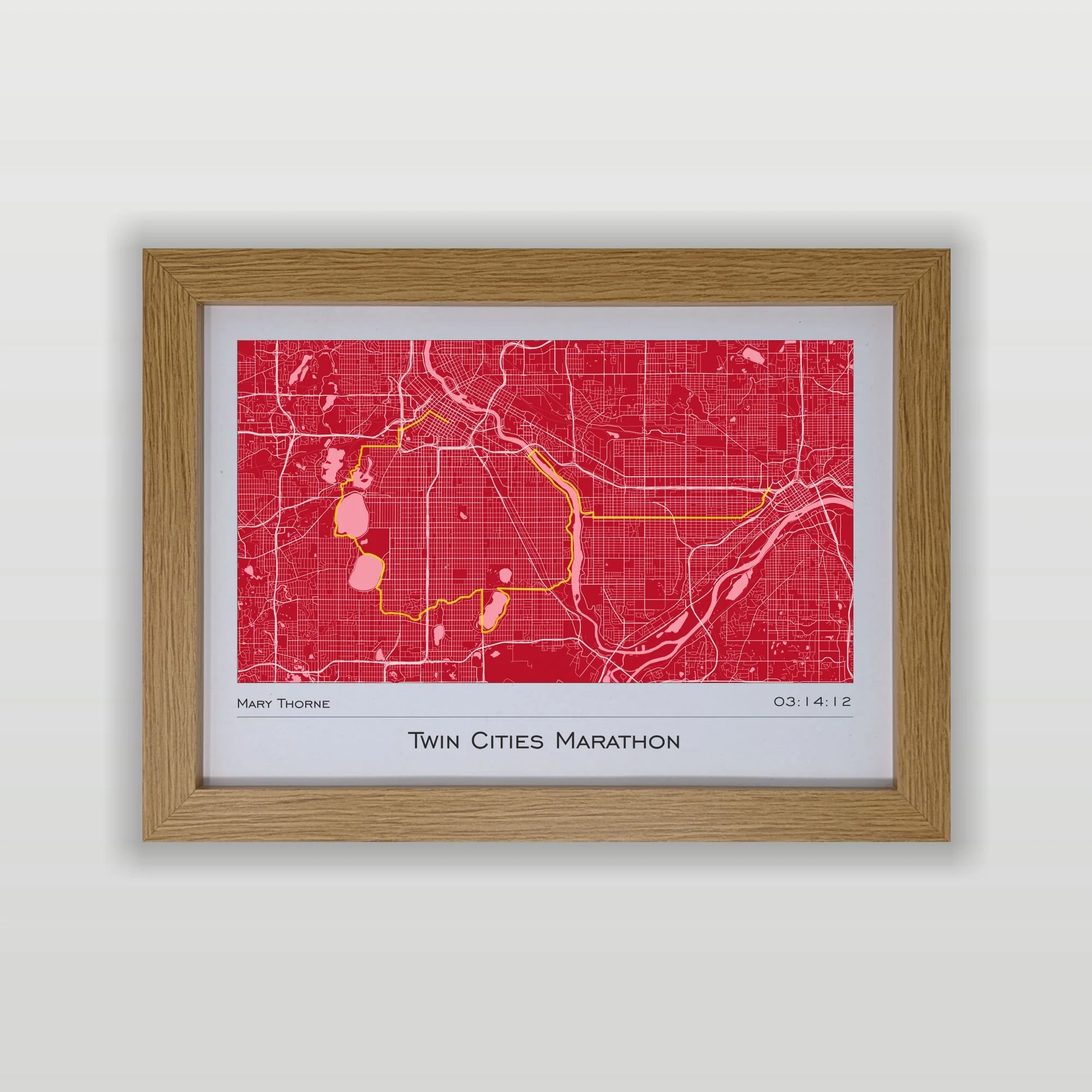 Create a beautiful Twin Cities marathon marathon route map and double medal display for your Twin Cities marathon marathon medals. All our Twin Cities marathon marathon route maps and double medal displays come framed as standard. Professionally printed on photographic grade paper and framed for a stunning finish. These can be made for “Any” run. (how?)